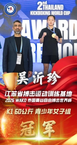 本次赛事中,来自中国的小将吴沂珍表现亮眼,一路过关斩将闯入决赛。吴沂珍就读于宿迁市体育运动学校八年级二班,此次出征由江苏省搏击运动训练基地主任董亮、教练刘永远带队指导。在K1规则60公斤青少年女子组决赛中,吴沂珍充分发挥自身技术优势,凭借灵活的走位、精准的击打和顽强的斗志,最终战胜对手,斩获该组别冠军金牌,站上了世界杯赛事的最高领奖台。